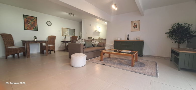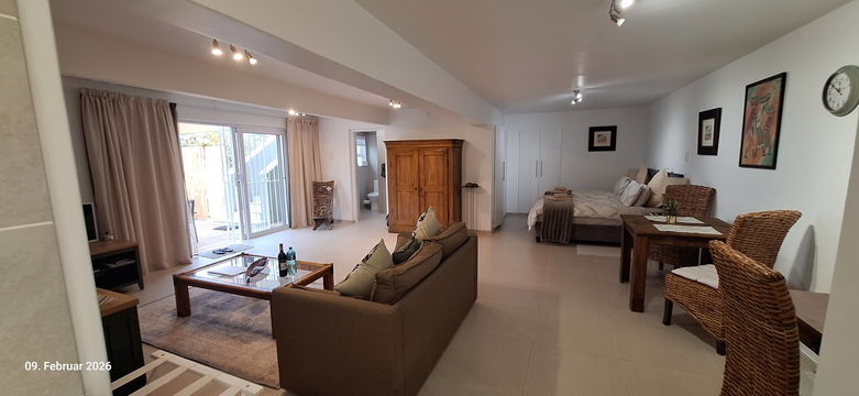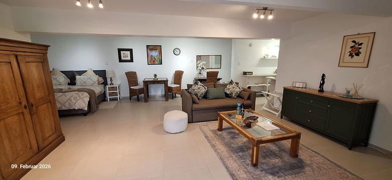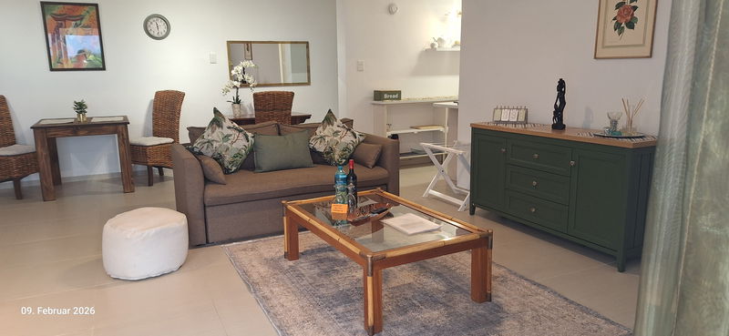 The 55m2 apartment is an elegant open plan unit with beautiful views. It has a large patio which has direct access to the extensive garden and swimming pool. The apartment offers a lounge with sleeper couch, a Smart TV with international internet channels, , free Wi-Fi and an office desk. There is a kitchen and dining area as well as modern bathroom with shower. The bedroom area offers 2 comfortable Twin Beds; the built-in cupboards house a safe and a hair dryer. The unit is serviced.